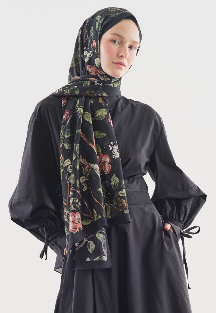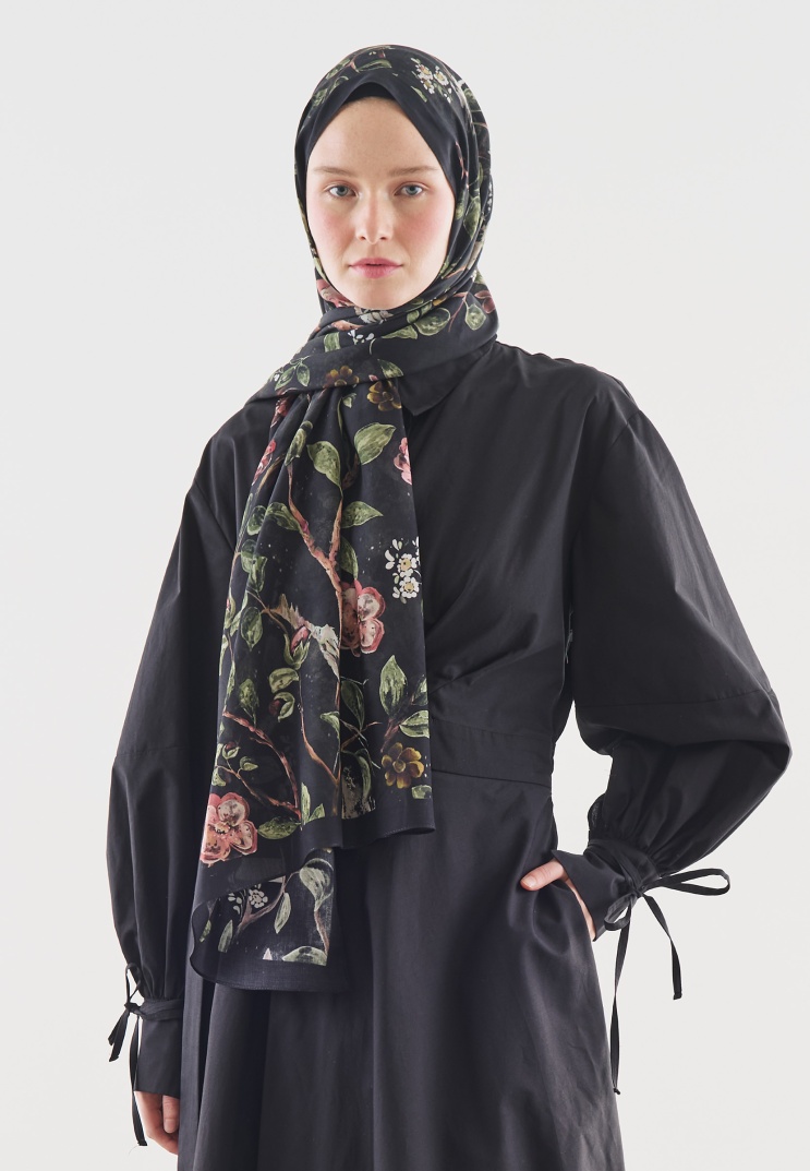 FLOWER RAIN DESENLİ PAMUK VİSKON ŞAL SİYAH