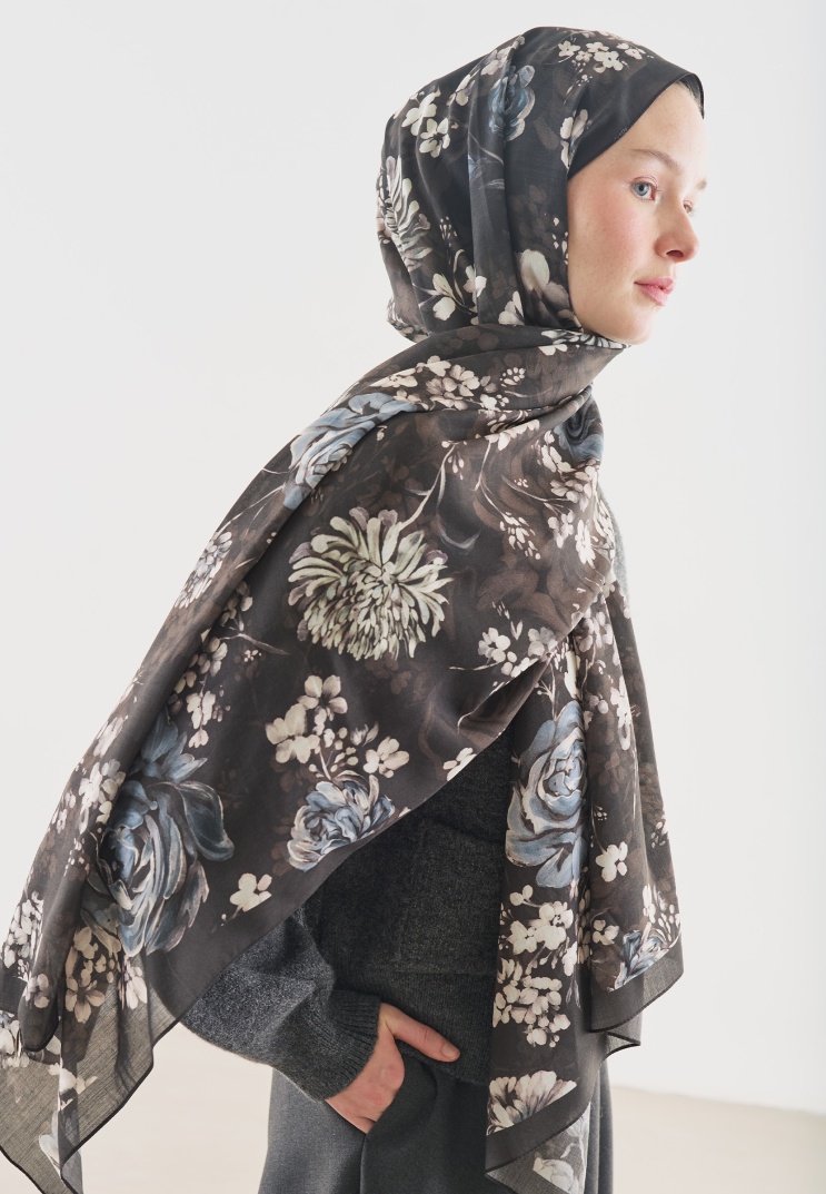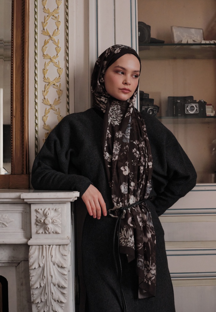 MIDNIGHT ROSE DESENLİ PAMUK VİSKON ŞAL KAHVE