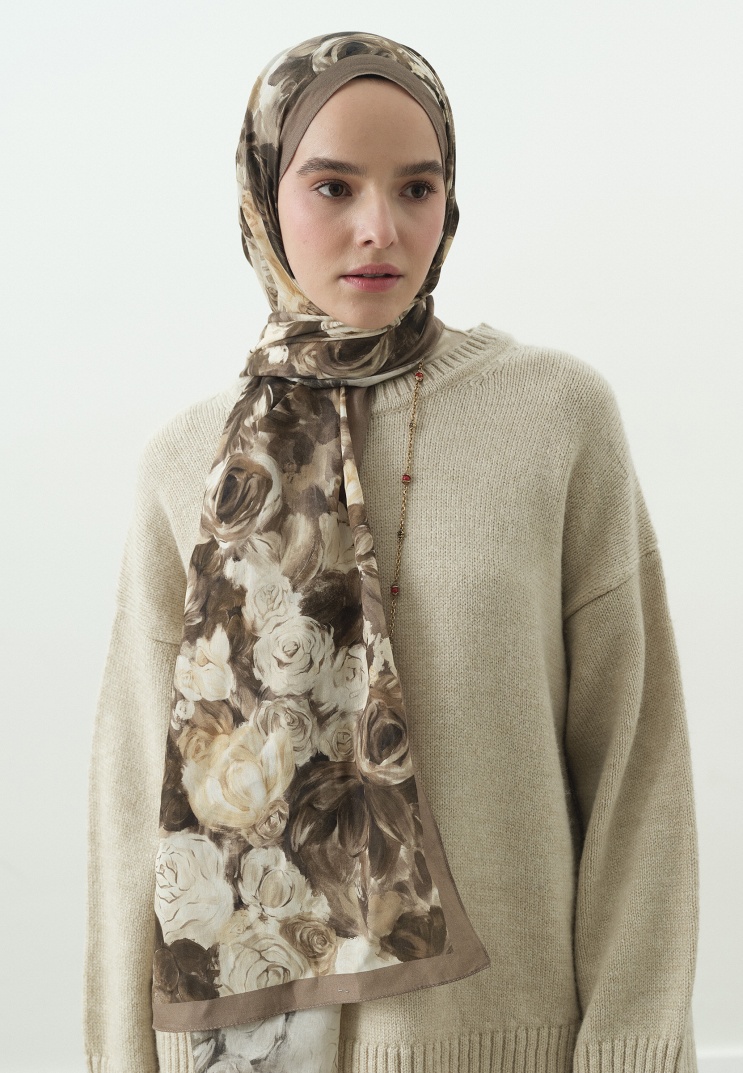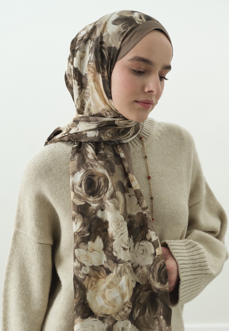 ROSE BREEZE DESENLİ PAMUK VİSKON ŞAL VİZON